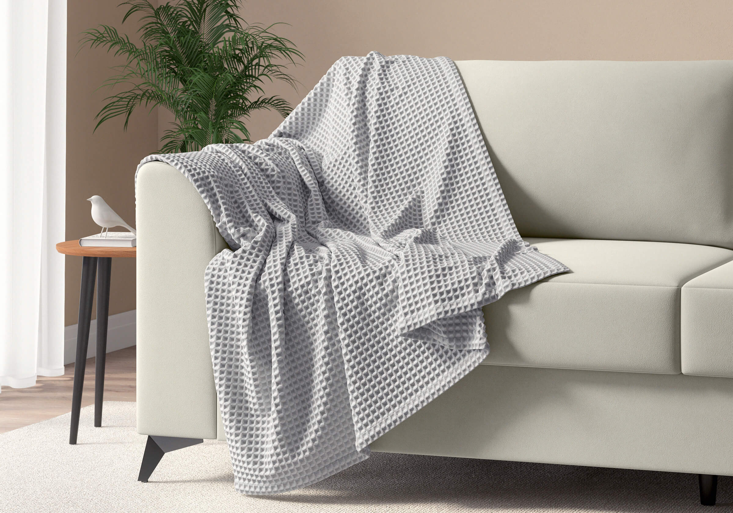 Плед Marko - мягкий вафельный плед, изготовлен из 100% натурального хлопка, который обладает хорошей воздухопроницаемостью. Глубокая рельефная ткань выглядит стильно и идеально вписывается в интерьер — будь то спальня в стиле минимализм, гостиная в скандинавском духе или уютный уголок с креслом и книжной полкой. Плед дарит ежедневное ощущение комфорта и теплой заботы благодаря хорошей плотности ткани, которая останется с вами на долго.